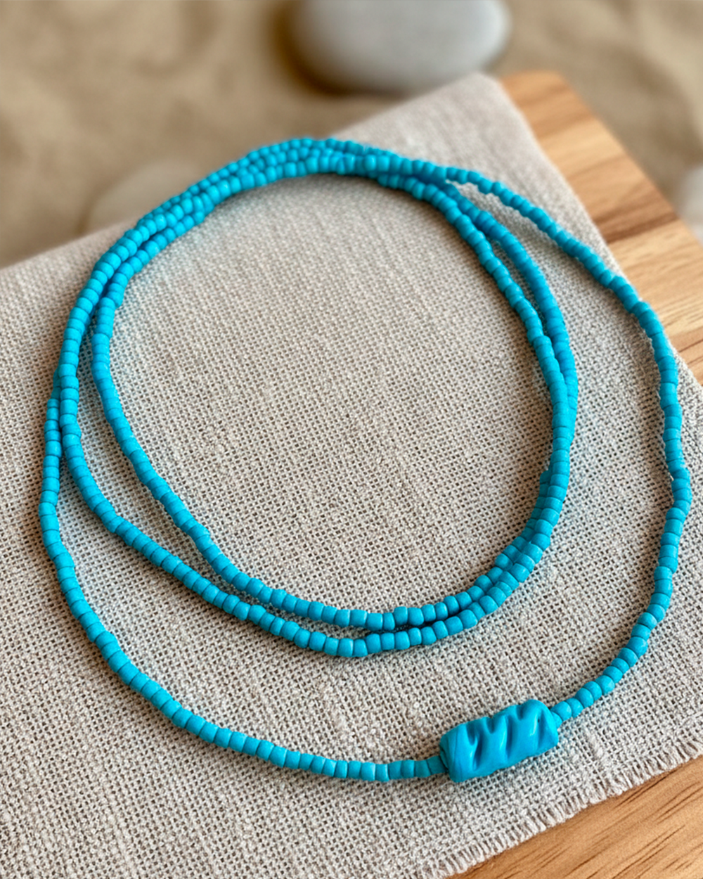 Fio de conta tradicional dedicado a Iemanjá, confeccionado com miçangas na cor azul cristal, representando proteção, maternidade, equilíbrio e a força das águas nas religiões de Matriz Africana.