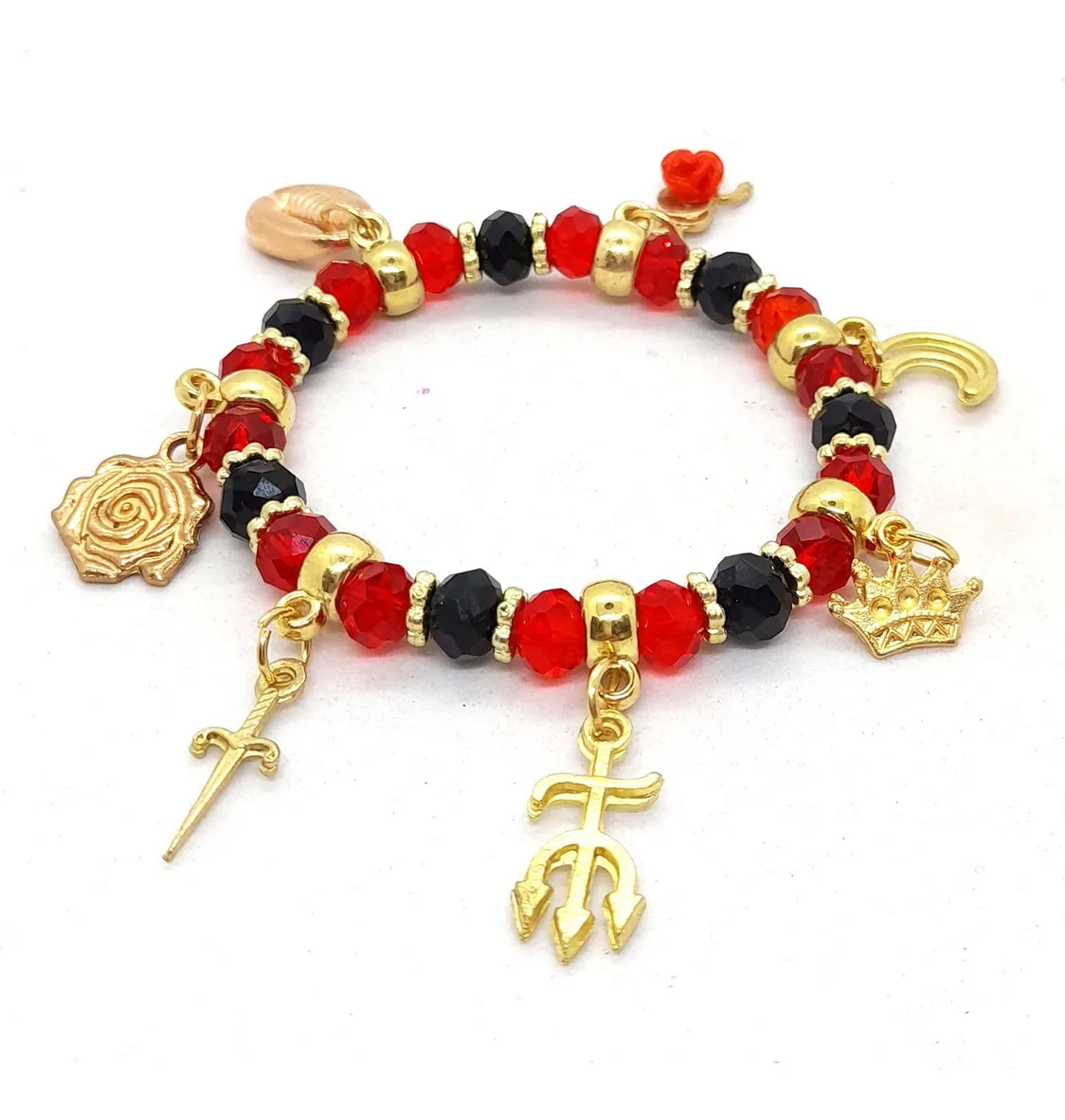 Pulseira vermelha crista, e preta e acessórios dourado.
