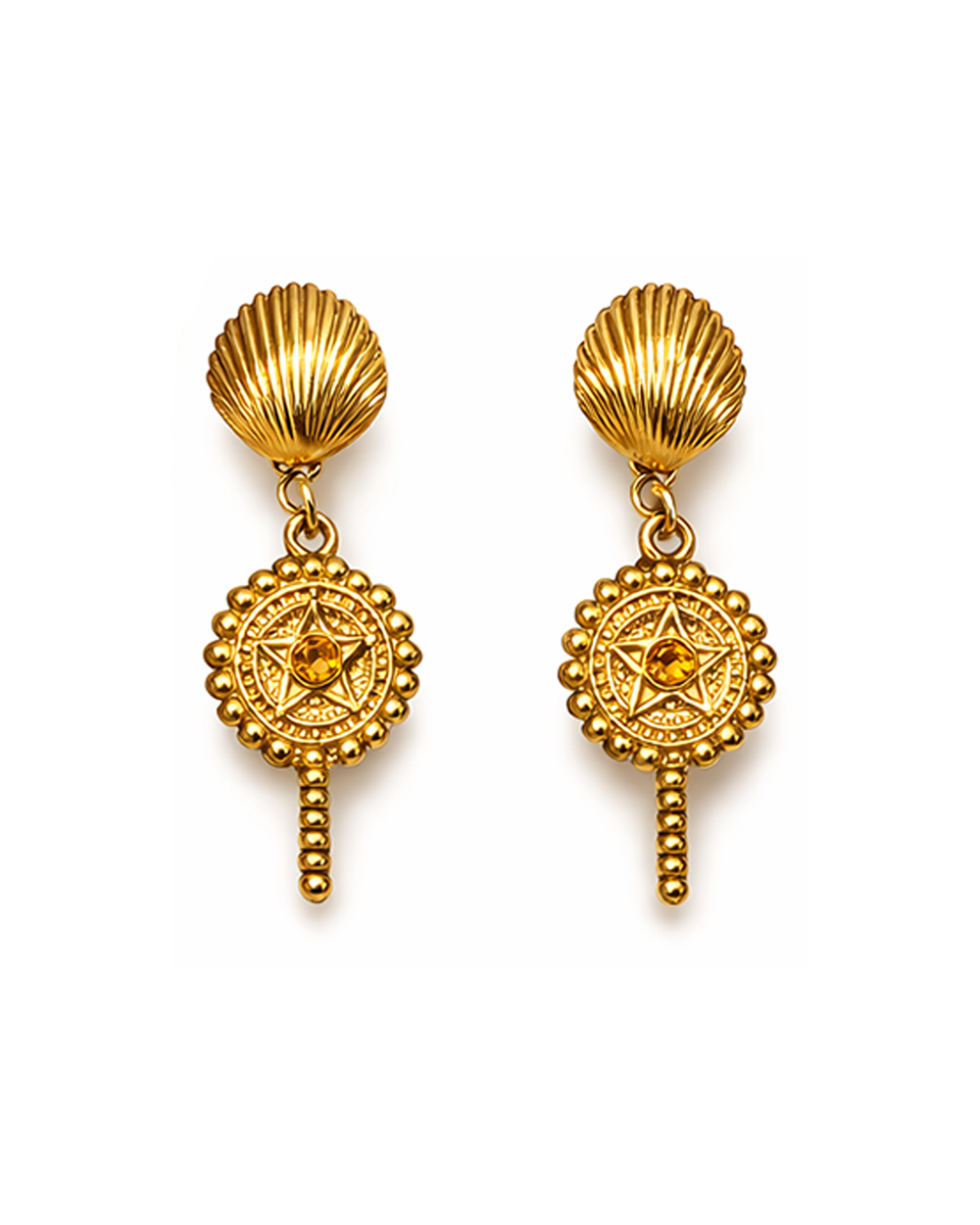 O Brinco Omi Dourado com Búzio e Pingente Espelho é um acessório elegante inspirado na simbologia do mar e na espiritualidade das águas.