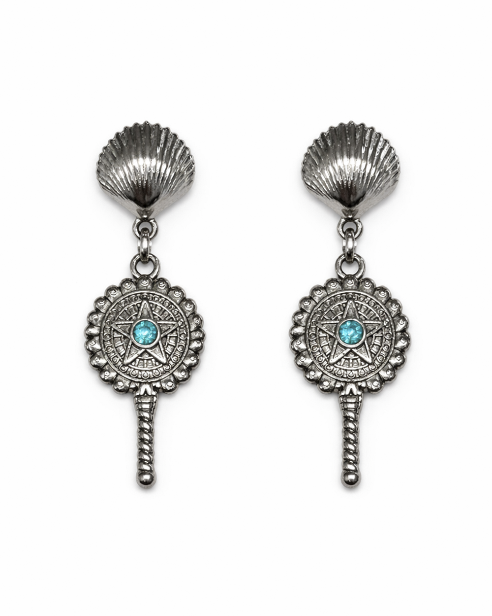 O Brinco Omi Prateado com Búzio e Pingente Espelho é um acessório elegante inspirado na simbologia do mar e na espiritualidade das águas.