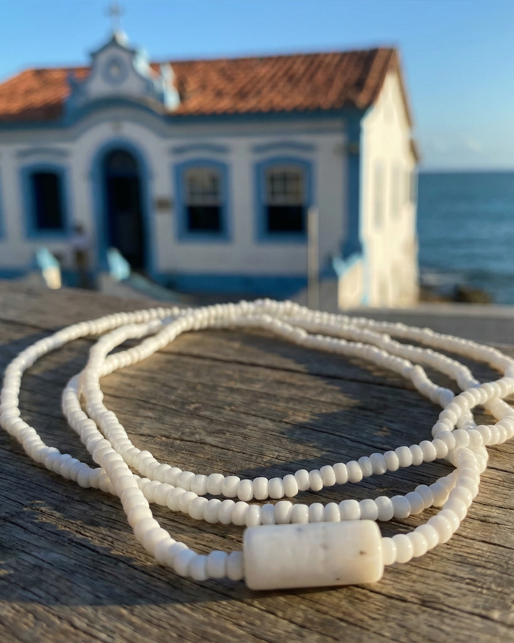 Fio de conta tradicional dedicado a Oxalá, confeccionado com miçangas na cor branca, símbolo de paz, pureza e sabedoria nas religiões de Matriz Africana.