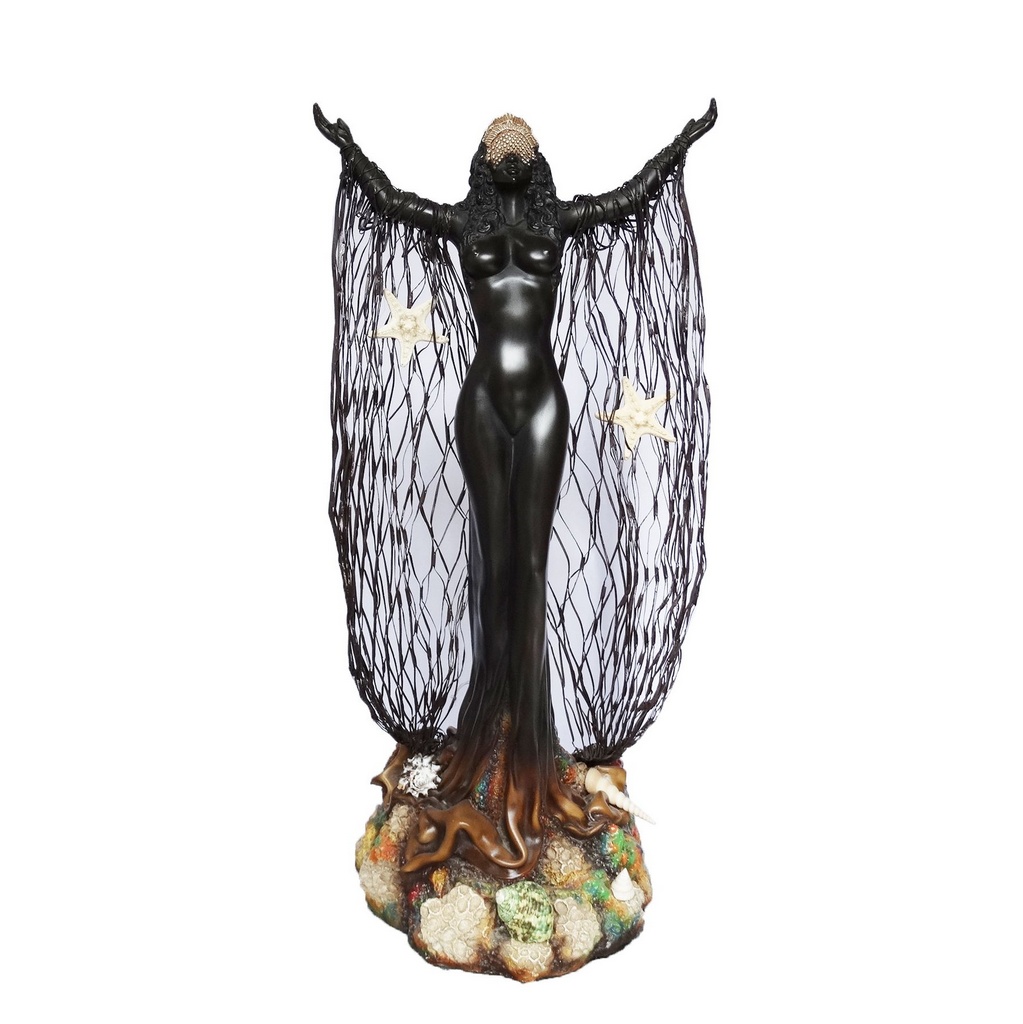 Produzida em resina de alta qualidade, recebe pintura artesanal e aplicação de tela para estuque e conchas marítimas variadas, valorizando cada detalhe da representação da Rainha do Mar. Seu tamanho expressivo confere presença marcante e sofisticação ao ambiente.