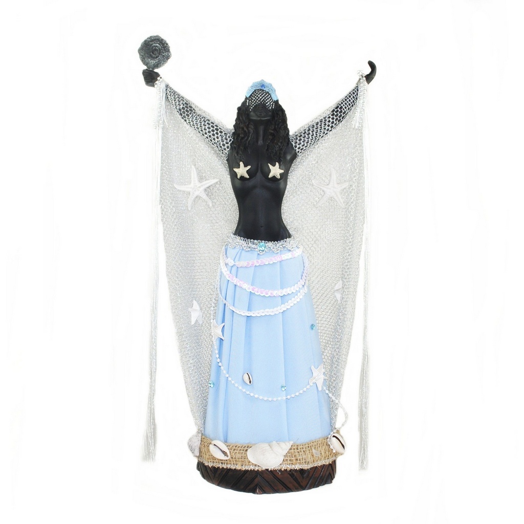 Confeccionada em resina de alta qualidade, recebe pintura artesanal e aplicação de tecido e búzios, valorizando cada detalhe da representação da Rainha do Mar. A peça transmite elegância, proteção e a energia das águas, tornando-se um destaque em qualquer ambiente.