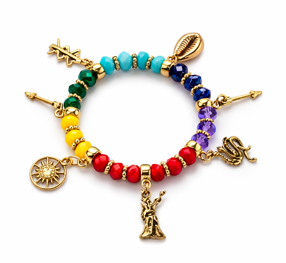 Pulseira amarelo e preto com acessórios dourados.