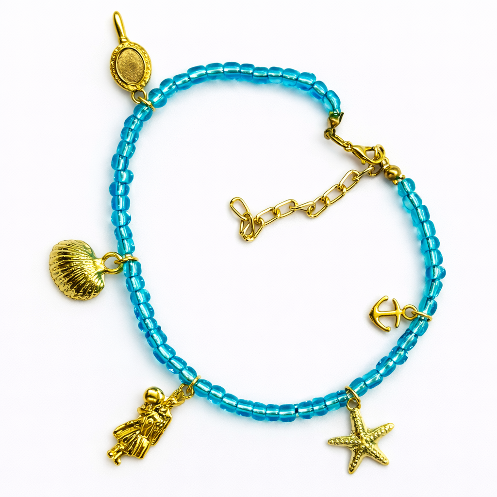 A Tornozeleira de Iemanjá é confeccionada com miçangas na cor azul claro, tonalidade associada à proteção, maternidade e à força das águas. Desenvolvida para uso religioso e também como expressão de fé no dia a dia.