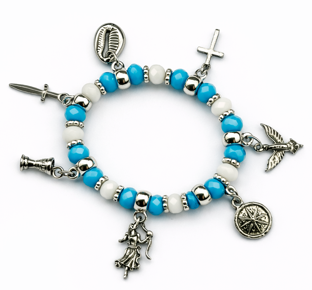 Pulseira azul e branca e acessórios prateado.